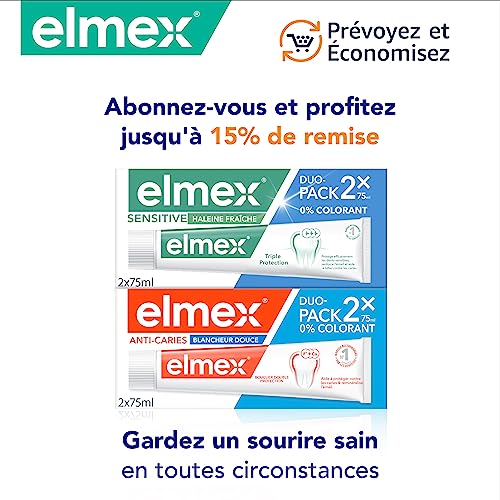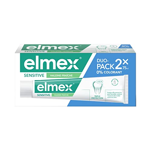 ELMEX DENTIFRICE HALEINE FRAÎCHE POUR DENTS SENSIBLES : Ce dentifrice possède une formule sans colorants, spécialement conçue pour soulager la sensibilité dentaire et protéger les dents contre les caries tout en laissant votre bouche fraîche.